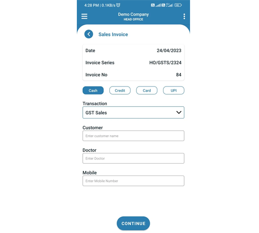 • Sales Invoice Entry interface of the Demo Company (Head Office) application allows users to record details of a new sales invoice transaction.